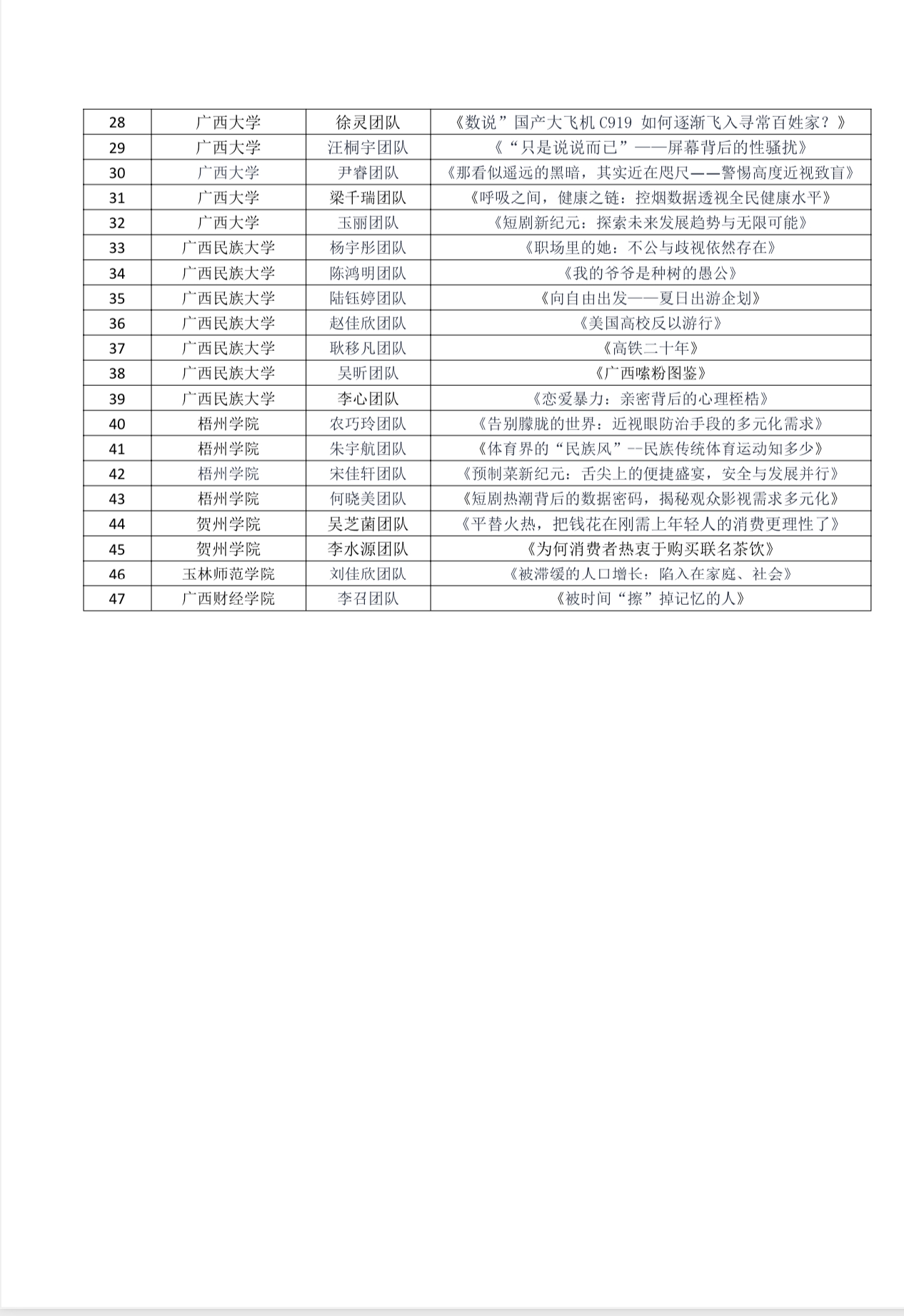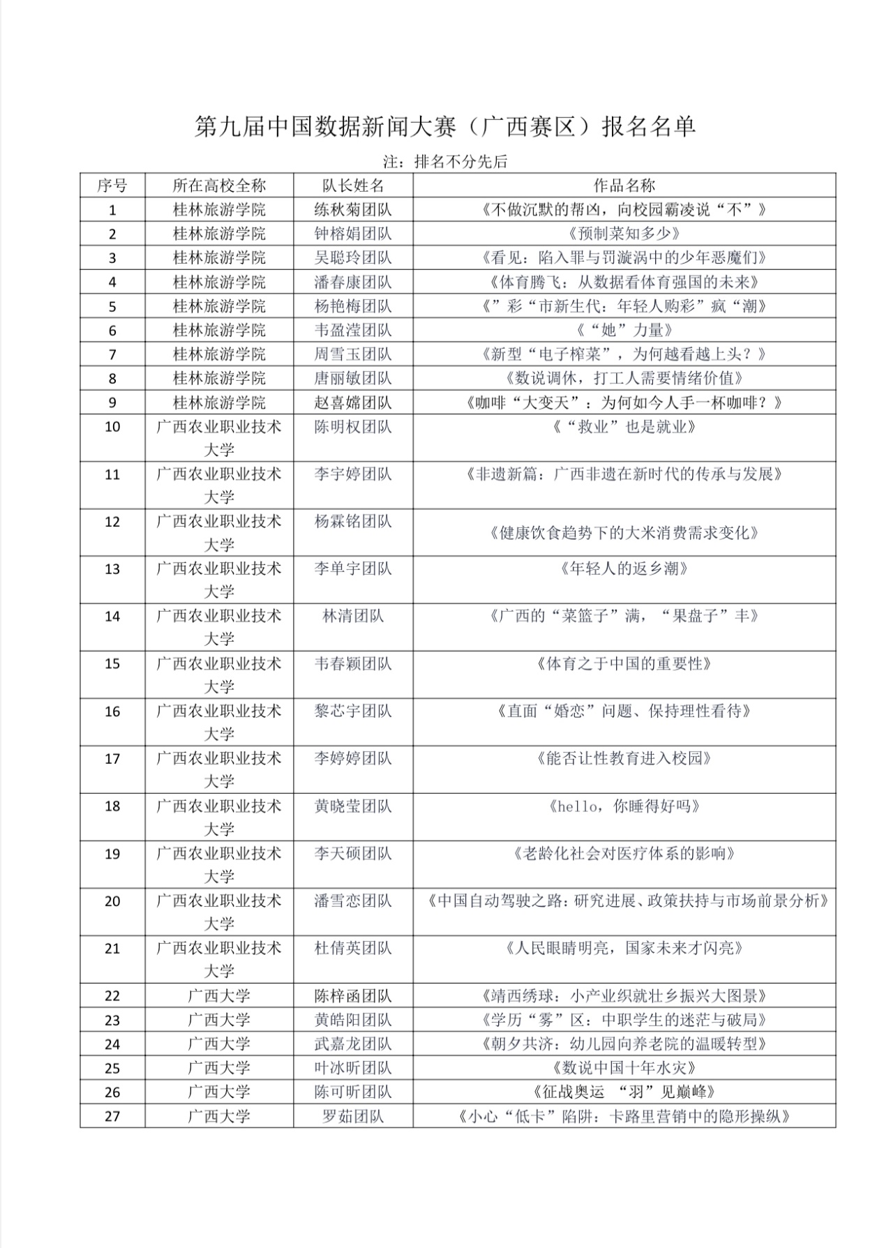 截至9月12日,经过前期报名与作品提交,由广西赛区组委会复审核查后,第九届中国数据新闻大赛广西区赛共有47份数据新闻作品报名成功,现予以公示。