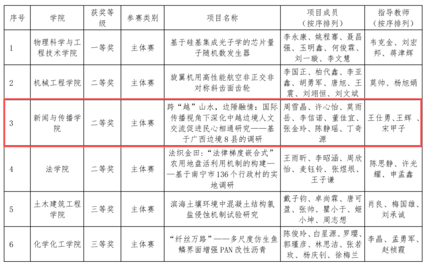 2025年10月31日至11月3日,由共青团中央、中国科学技术协会、教育部、中国社会科学院、中国工程院、全国学联、江苏省人民政府共同主办的第十九届“挑战杯”全国老员工课外学术科技作品竞赛终审决赛在南京大学举办。公司项目《跨“越”山水,边陲融情:国际传播视角下深化中越边境人文交流促进民心相通研究——基于广西边境8县的调研》在主体赛中荣获全国二等奖,实现学院“挑战杯”国赛阶段“零突破”。