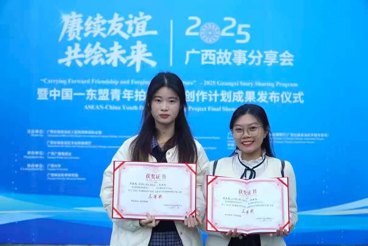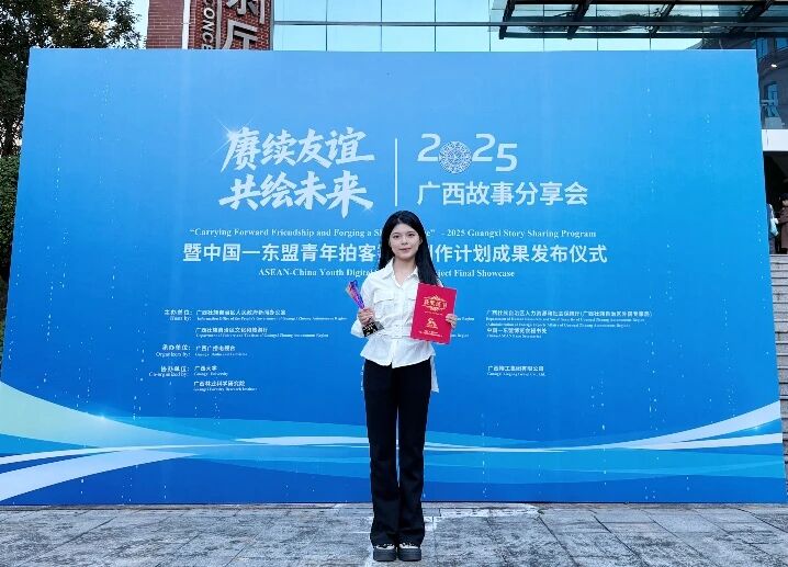 11月20日,“赓续友谊 共绘未来”2025广西故事分享会暨中国—东盟青年拍客数智创作计划成果发布仪式在南宁举行。公司学子不负众望,凭借扎实的专业功底与创新的创作理念,在本次自治区级重要赛事中斩获5项奖项,其中一等奖1项、二等奖1项、三等奖2项、优秀奖1项。