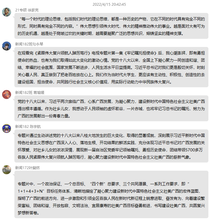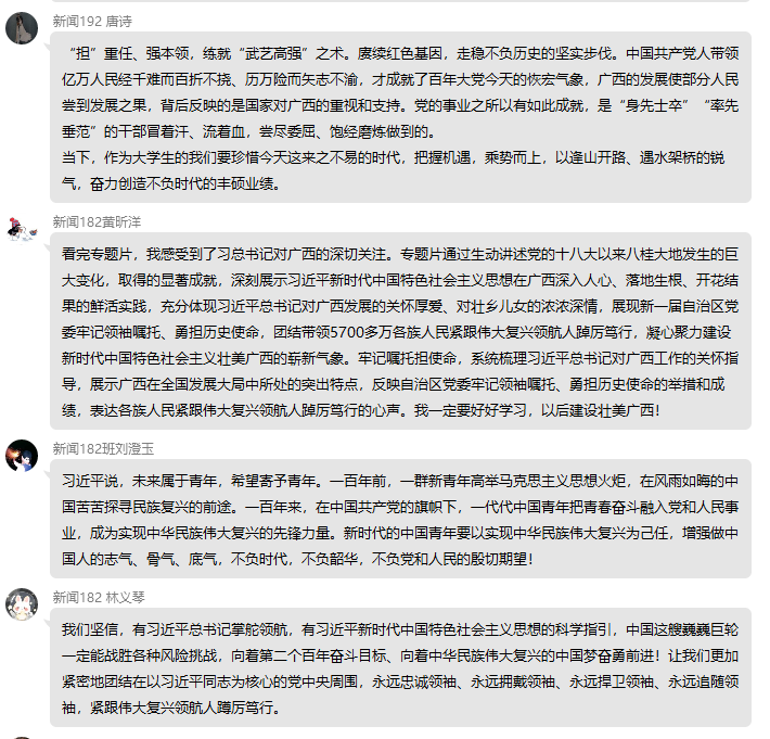 在活动中,各位同志认真观看视频,并在支部群中纷纷发表自己的观后感。从发言中了解到,同志们对于此次的学习内容感悟深刻,有自己的观点和看法。支部党员蒙甜甜表示:“习近平总书记来广西实地考察、实地调研,一路走来,做出了许多重要指示。习近平总书记的指示,为广西未来发展指明了方向,也鼓舞了壮乡人民。今天的广西,既有天时地利,又有了更多的发展机遇。时代在召唤,八桂大地在召唤,作为一名党员、新时代的有志青年,我们应该积极投入到广西的发展建设中,以我们的知识才干与青春热血,编织出广西壮锦般美好的未来,以昂扬姿态、扎实行动,迎接党的二十大胜利召开。” 支部成员新闻182班蒋瑜媛表示,作为壮乡儿女,在感动于人民领袖的虚怀若谷、一片赤诚的同时,也将牢记习近平总书记的嘱托,努力为广西的发展献出一份青春力量。新闻182班勾永琴在观看完影片后,既感怀于近年来八桂大地发生的巨大变化,也激发起其勇担使命的热血情怀。她认为,作为新时代的老员工,更应该主动、积极、创造性地去建设祖国、担当使命,共同践行社会主义核心价值观,用实际行动助力中华民族伟大复兴。