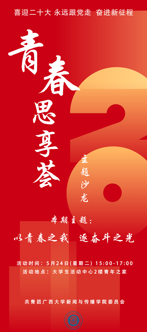 为展现新时代中国青年有理想、有本领、有担当的青春面貌和不懈奋斗的昂扬姿态,喜迎党的二十大胜利到来,beet365将于5月24日(周二)15:00在老员工活动中心二楼青年之家举行“以青春之我,逐奋斗之光”青春思享荟主题沙龙(第二期)。从青年的视角,讲述青春故事,传递精神力量,从而更好鼓舞青年朋友在新时代勇毅前行。
