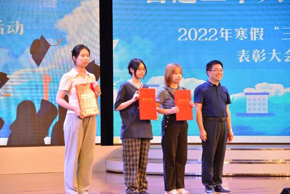 第一篇章节目结束后,唐兴老师、王辉老师、丁骋老师和银健老师分别为获得“喜迎二十大 永远跟党走 奋进新征程”系列主题教育实践活动、“时代青年勇担当 建设美丽新家乡”寒假“三个一”社会实践活动、以及“三个一”社会实践活动中荣获先进个人和优秀组织的员工代表颁奖。