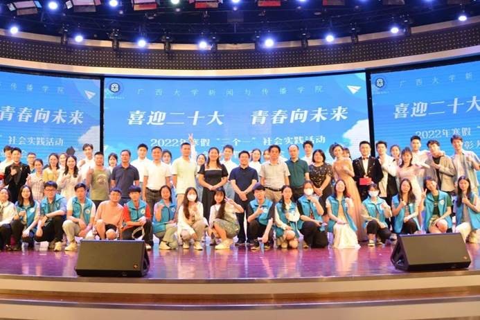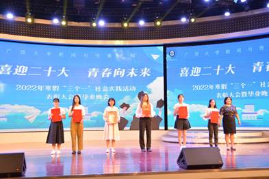 为响应学校号召,开展“喜迎二十大、永远跟党走、奋进新征程”主题教育实践活动,同时对今年公司寒假“三个一”社会实践活动进行总结,并表彰优秀获奖同学,以及为毕业生提供一个回顾过去、展现自我、放眼未来的平台,给即将毕业的学子送上最真切的期望和祝福,6月12日晚,公司在融媒体中心举行2022年寒假“三个一”社会实践活动表彰大会暨毕业晚会。本次晚会以“喜迎二十大,青春向未来”为主题。公司党委书记唐兴、党委副书记银健、电气工程公司党委副书记雷圆媛、副经理王辉、副经理丁骋、副经理朱学峰、团委书记刘梦娟以及新东方南宁学校董事长范超等领导老师莅临本次晚会,与同学们一起欣赏这场视听盛宴。