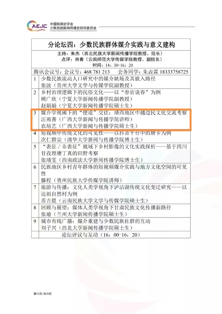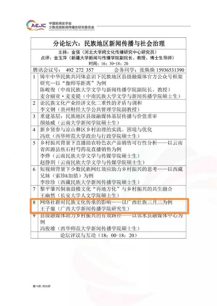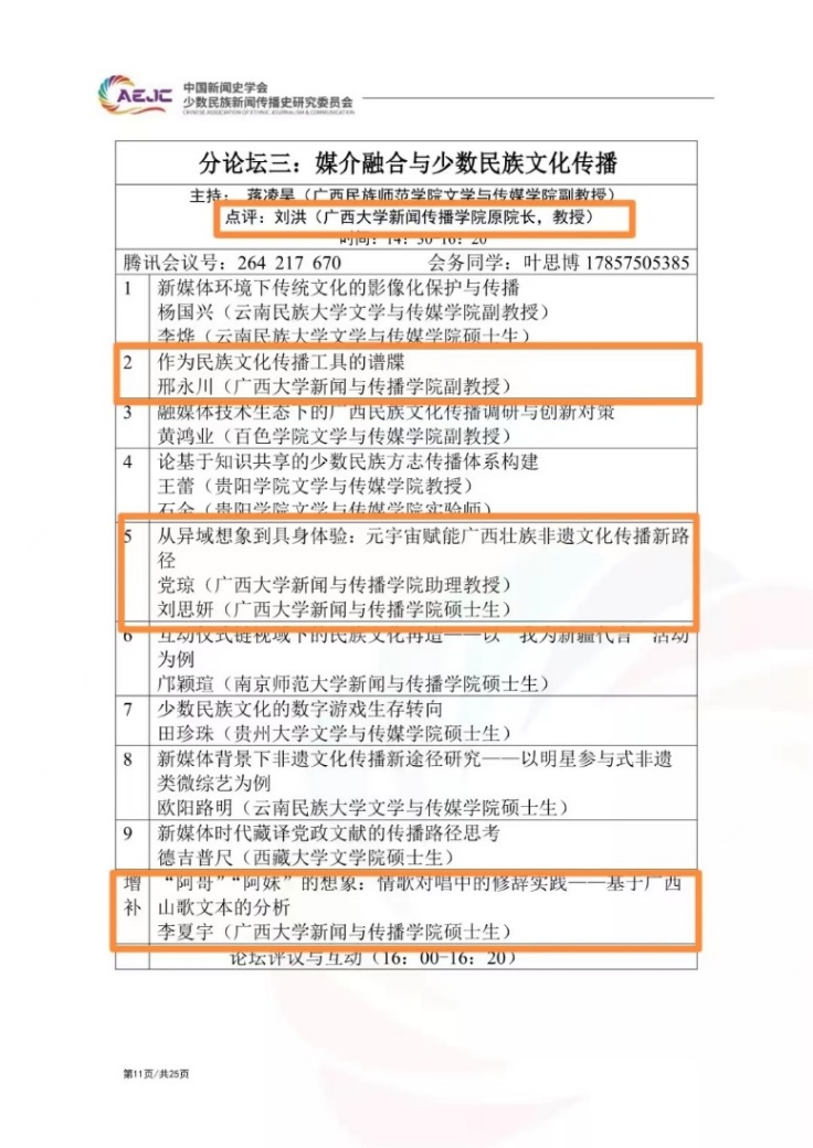 此次研讨会设有大会主题发言和8个分论坛交流会。其中,刘洪老师作题为《民族文化符号区域化传播分析》的主题发言;在第三分论坛,邢永川老师讲述了《作为民族文化传播工具的谱牒》,党琼老师和刘思妍同学分享了《从异域想象到具身体验:元宇宙赋能广西壮族非遗文化传播新路径》,李夏宇同学带来《“阿哥”“阿妹”的想象:情歌对唱中的修辞实践——基于广西山歌文本的分析》;在第四分论坛,汪苑菁老师和农培艺同学讲述了《媒介学视阈下的“便道”交往:靖西地区中越边民文化交流考察》;在第六分论坛,王子璇同学发表题为《网络社群对民族文化传承的影响——以广西三月三为例》的主题。