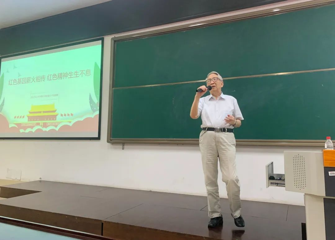 随后,物理学院退休老共产党员阳兆祥教授与同学们分享了他和共和国一起成长的人生经历,使在座的同学深受鼓舞和启发。他首先借用了毛泽东访问苏联时在莫斯科大学接见中国职工时发表的著名演讲:“世界是你们的,也是我们的,但是归根结底是你们的。你们青年人朝气蓬勃,好像早晨八九点钟的太阳。希望寄托在你们身上。”以此表达对年轻一代的期望。