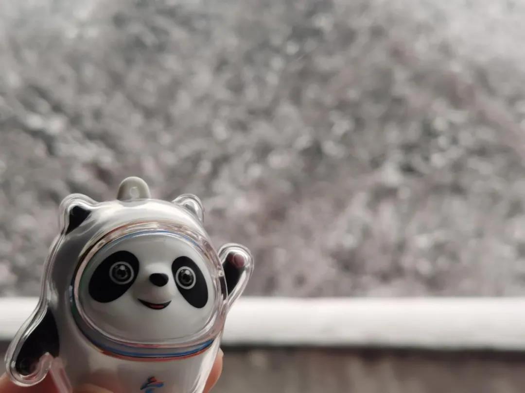 去给姥姥拜年,一路上大雪纷飞,路、山、树银装素裹、美不胜收,我把冰墩墩拿出来合影留念,喜迎冬奥会的到来。