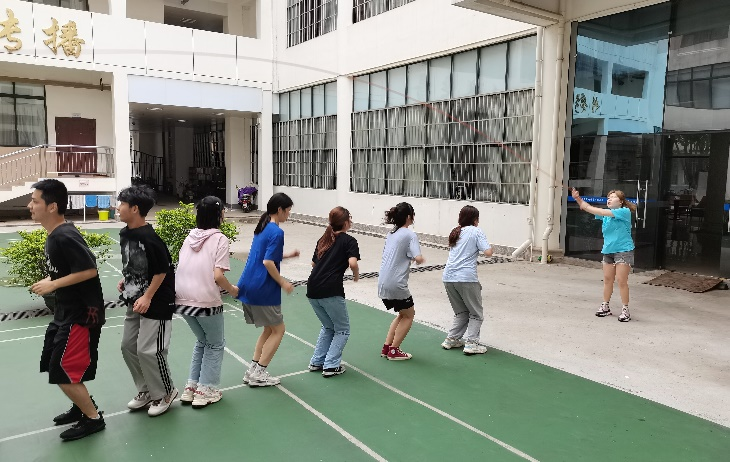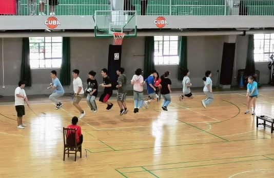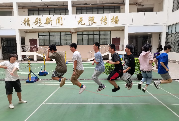 下午2时,参加三分钟10人集体跳绳的运动员们在学院排球场集合,在体育部负责人的组织下进行赛前热身训练。在训练过程中,运动员们发现起跳存在问题,便按照身高和跳绳熟练度对站位进行及时调整。