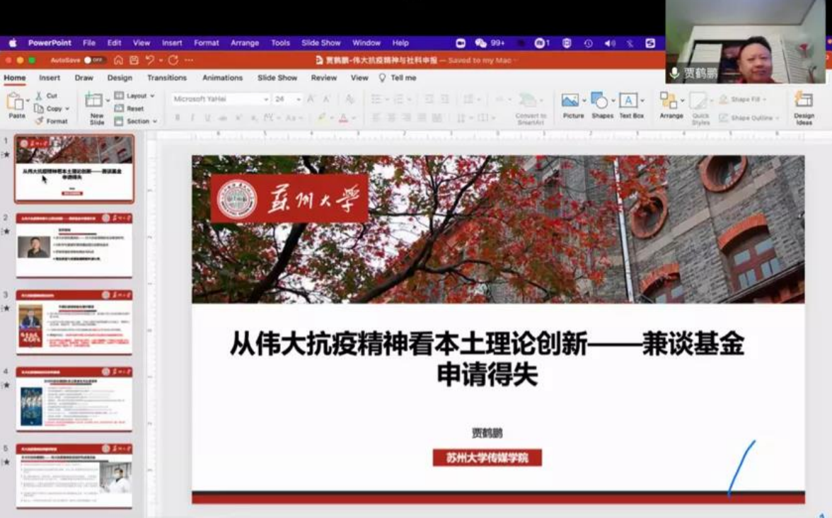1月22日晚,公司邀请苏州大学传媒学院贾鹤鹏教授作题为《从伟大抗疫精神看本土理论创新——兼谈基金申请得失谈》的讲座。本次讲座在腾讯会议线上举行,由学院气候与健康传播研究中心主任吴海荣教授主持,副经理王辉以及100多位师生在线聆听。