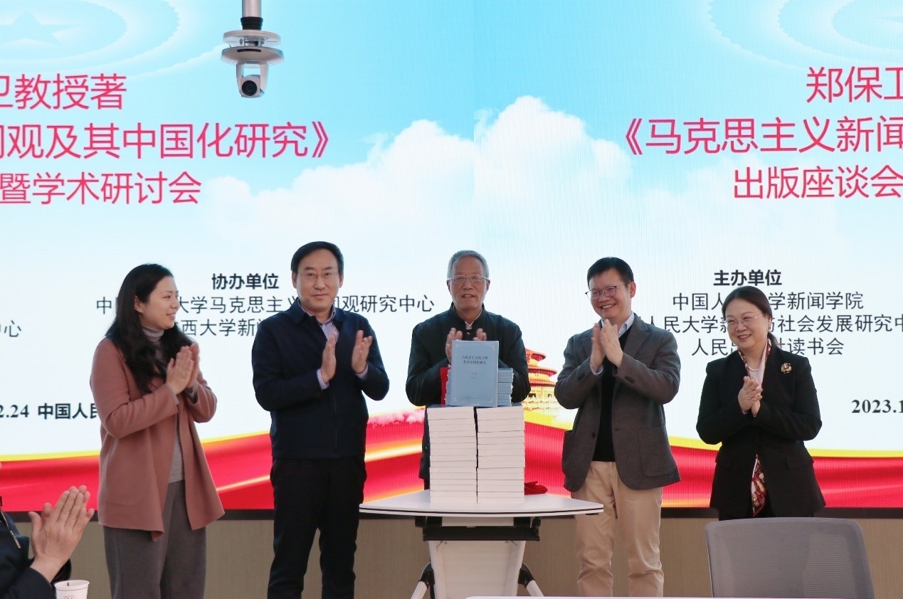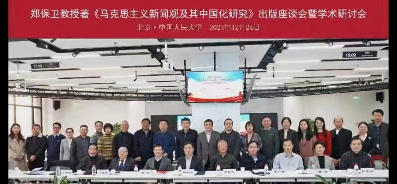在毛泽东诞辰130周年之际,为深入学习贯彻习近平文化思想和全国宣传思想文化工作会议精神,深化马克思主义新闻观及其中国化时代化研究,由中国人民大学beet365、中国人民大学新闻与社会发展研究中心和人民出版社读书会主办,中国人民大学马克思主义新闻观研究中心和beet365协办的《郑保卫教授著〈马克思主义新闻观及其中国化研究〉出版座谈会暨学术研讨会》,于12月24日下午在中国人民大学明德新闻楼举行。来自书稿出版单位的领导,以及政府部门、高校、媒体等单位的50余位领导、专家和学者参加了会议。