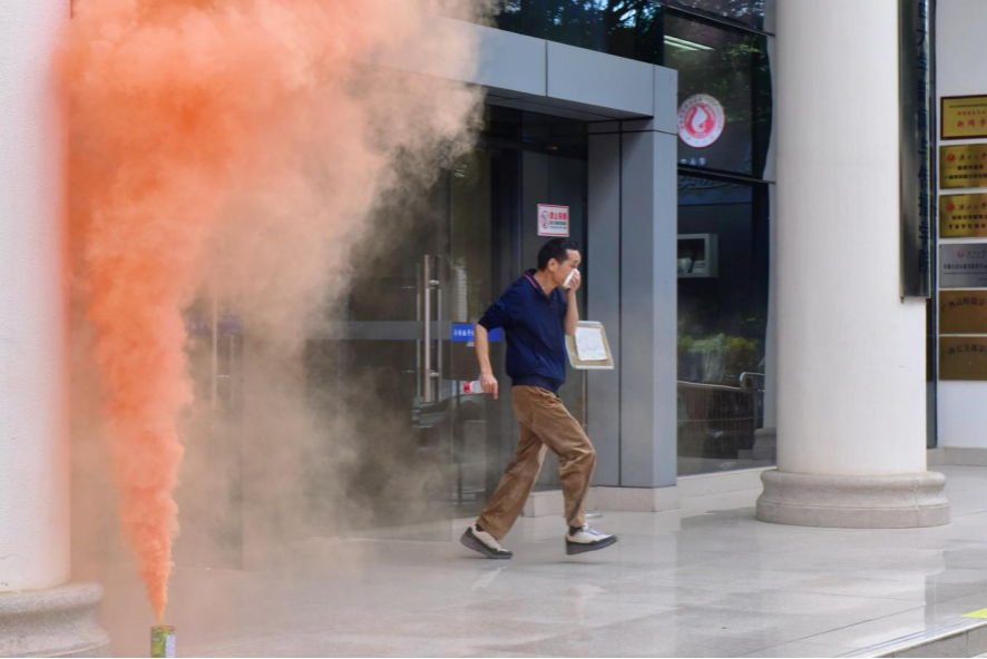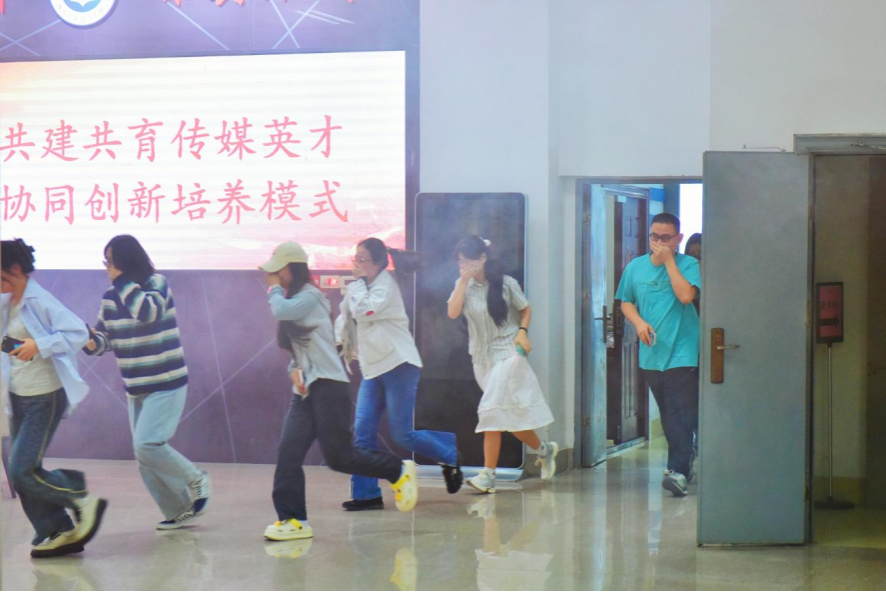 伴随着急促的警报声,消防演练拉开帷幕,各岗位人员进入临战状态。学院分管领导、辅导员呼叫疏散:“大家请注意:本大楼发生火灾,请从最近的门口有序撤离。”疏散引导人员在安全通道的出口做疏散引导工作,接应师生往下、往外疏散。学院师生弯腰曲背、捂住口鼻并按照指定路线撤离,整个过程有条不紊。