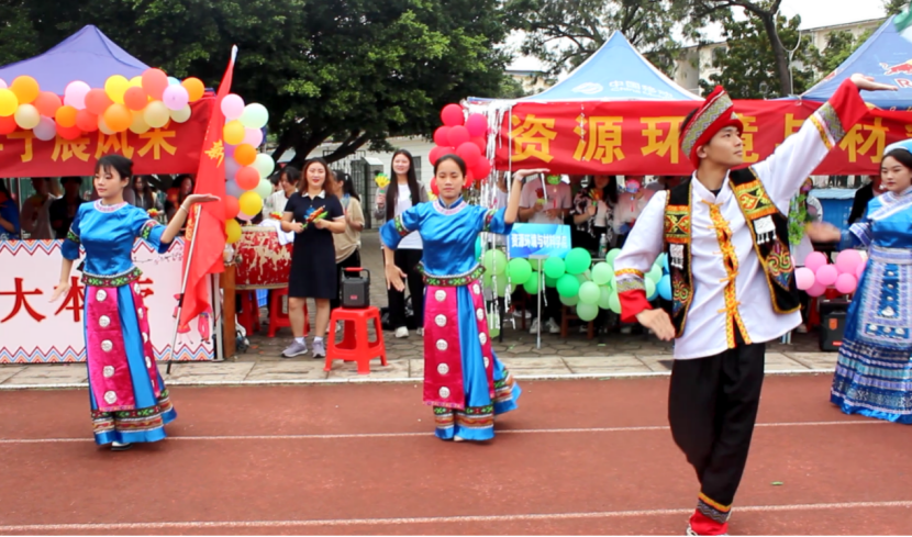 广西“三月三”自然少不了山歌对唱。公司学子与资源环境与材料学院的同学合作表演对山歌,为此次活动增添民俗氛围。表演的同学身着民族特色服装,大本营内的同学们挥动拍手、敲响大鼓,为表演的同学打节拍,优美的民族舞蹈和悠扬的歌声吸引来大批观众围观。