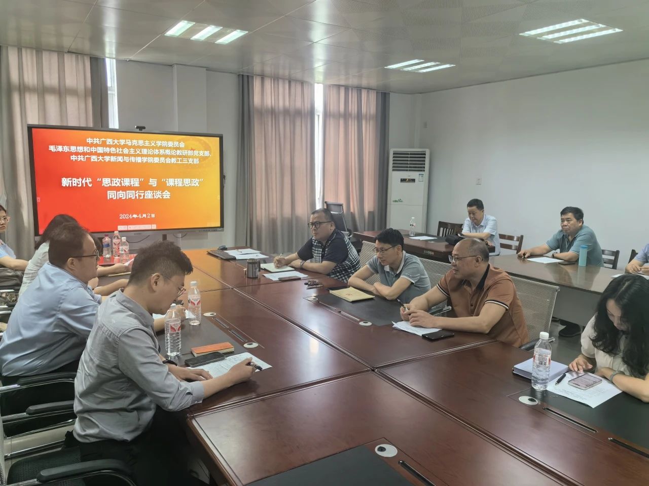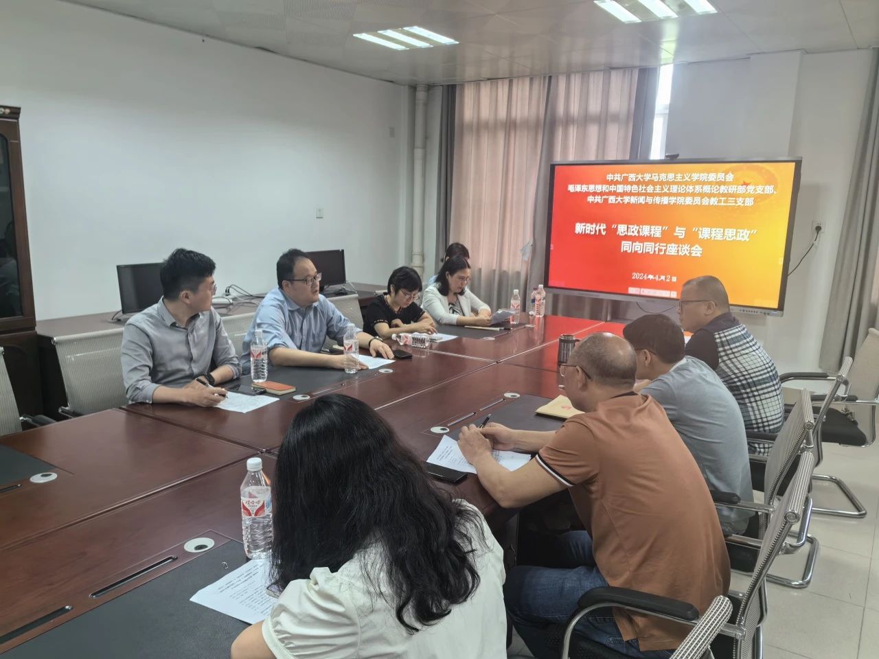 发言结束后,会议进行了10分钟的交流研讨环节,与会者积极提问、互相交流,深入探讨了课程思政建设中的具体问题与挑战。双方表示新闻传播学与马克思主义研究有很多共通处,加强马克思主义新闻观教育非常必要,以后要加强两个学院的合作。