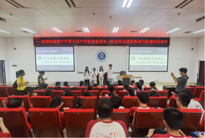 10月20日上午,南宁市第十四中学教育集团高二年级高考选科为历史的特训班38名员工来到公司进行研学之旅。公司张伟超老师与黄志宏老师携手四名本科生志愿者,以参观学院、专业宣讲和学长学姐分享交流等多种方式,向同学们全方位展现学院风貌,使来访师生沉浸式感受公司的教育理念与文化氛围,深入了解专业设置,亲身体验大学课程及学科魅力。