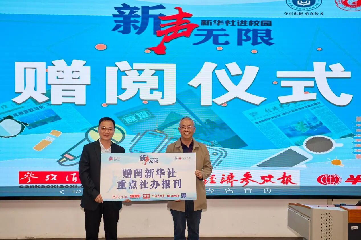 罗博在致辞中表示,“新华社进校园”活动是新华社进一步做好青年工作、培育时代新人的特色实践,旨在引导广大青年学子树立正确的新闻观、价值观,增强媒介素养与责任意识。他希望通过现场报刊赠阅和记者分享,让大家近距离感受国家通讯社的报道深度与专业精神,激发更多同学讲好中国故事、校园故事的信心与热情。