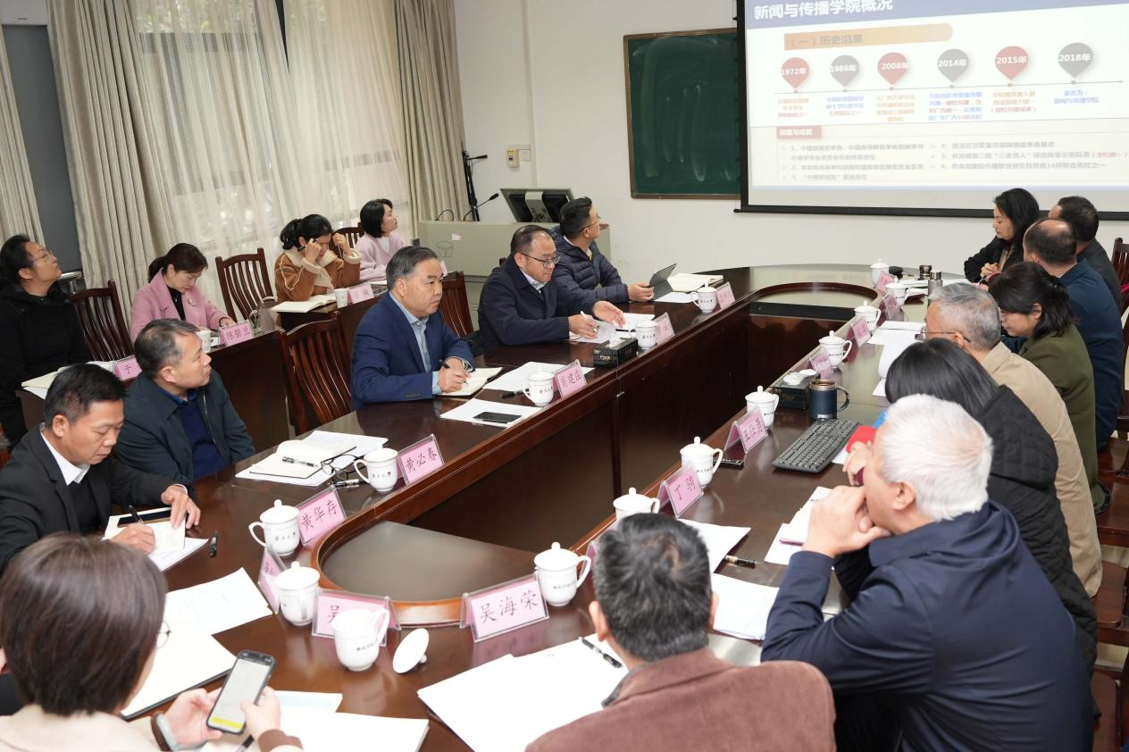 随后召开的座谈会上,学院经理王仕勇围绕学院发展历程、“十四五”期间工作成效、“十五五”发展目标与重点任务,以及请求学校支持事项等方面作了汇报。他表示,学院自1972年开办新闻学本科以来,始终坚持特色发展,在马克思主义新闻观教育、面向东盟的国际传播等领域形成明显优势,近年来在课程建设、学科竞赛、科研立项等方面取得一系列突破,但在博士点申报、团队规模、经费支持等方面仍面临发展瓶颈,希望学校在团队建设、专业拓展、条件保障等方面给予更多支持。