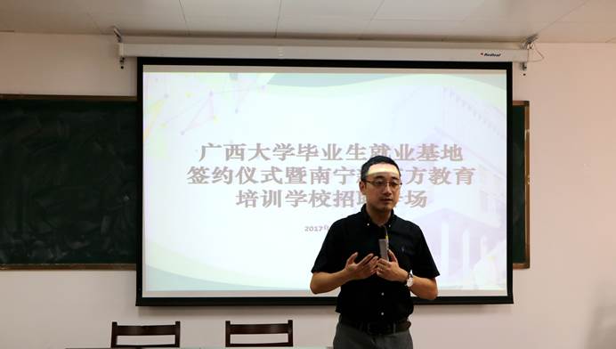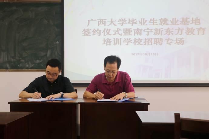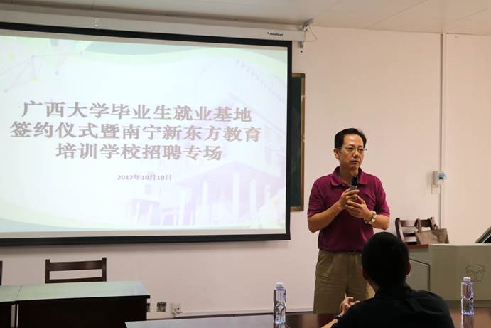 10月10日下午3时,beet365beet365与新东方教育科技集团南宁学校的beet365毕业生就业基地签约仪式暨新东方教育科技集团南宁学校招聘会在新闻大楼510教室举行。
