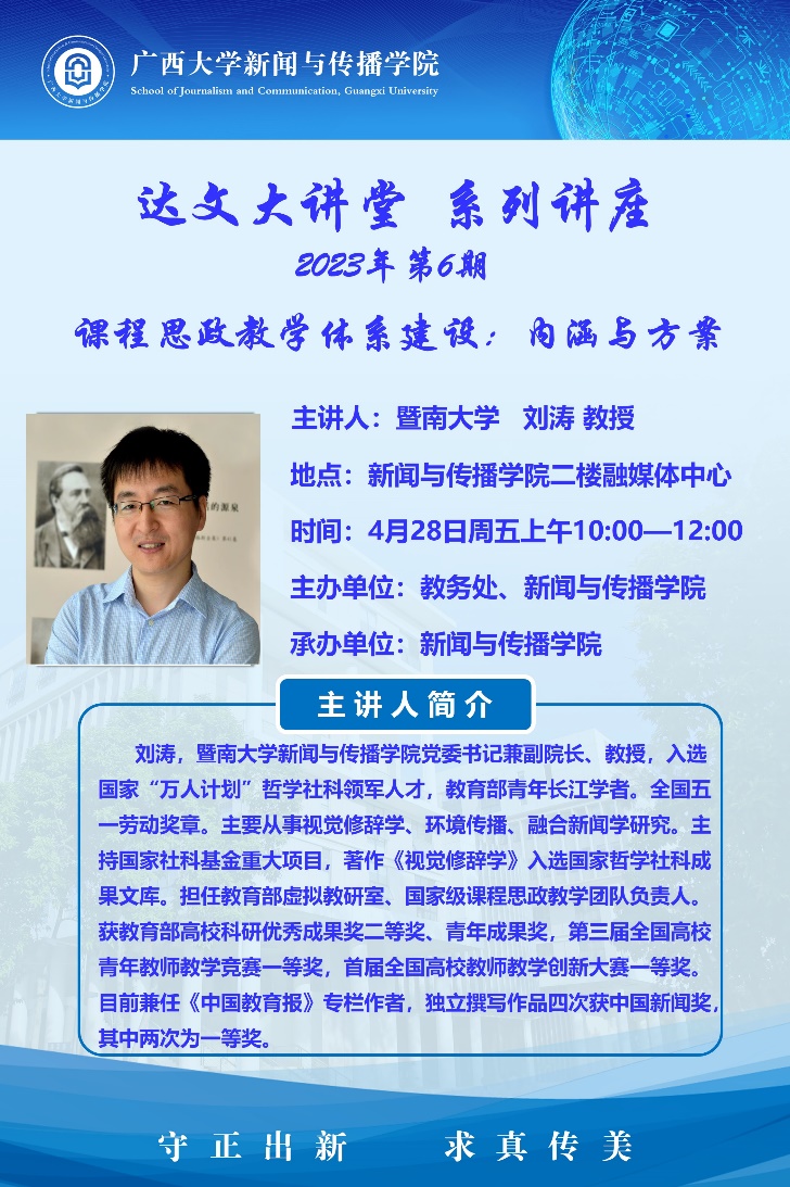 4月28日,暨南大学新闻与传播公司党委书记兼副经理、教授刘涛,做客公司“达文大讲堂”,在学院融媒体中心作了题为“课程思政教学体系建设:内涵与方案”的课程思政专题报告。讲座由公司党委书记唐兴主持。学院全体专任教师和各学院专任教师代表参加了报告会。
