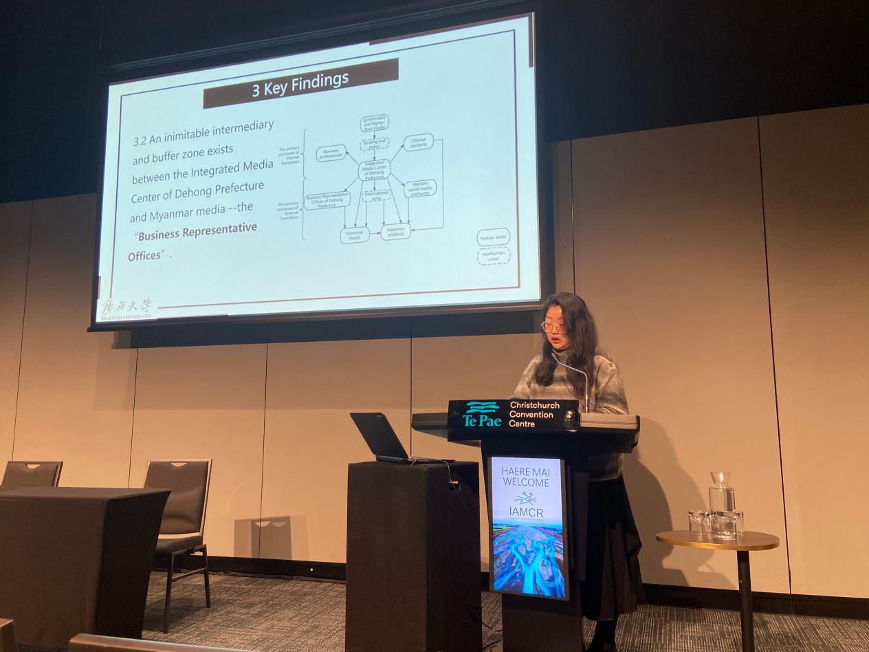 7月3日,公司2022级专业硕士生涂文嫱在新西兰坎特伯雷大学承办的国际媒介与传播研究学会(IAMCR)年会上发表了题为《行动者网络理论视角下中国边境地方媒体对缅传播研究》的学术报告。