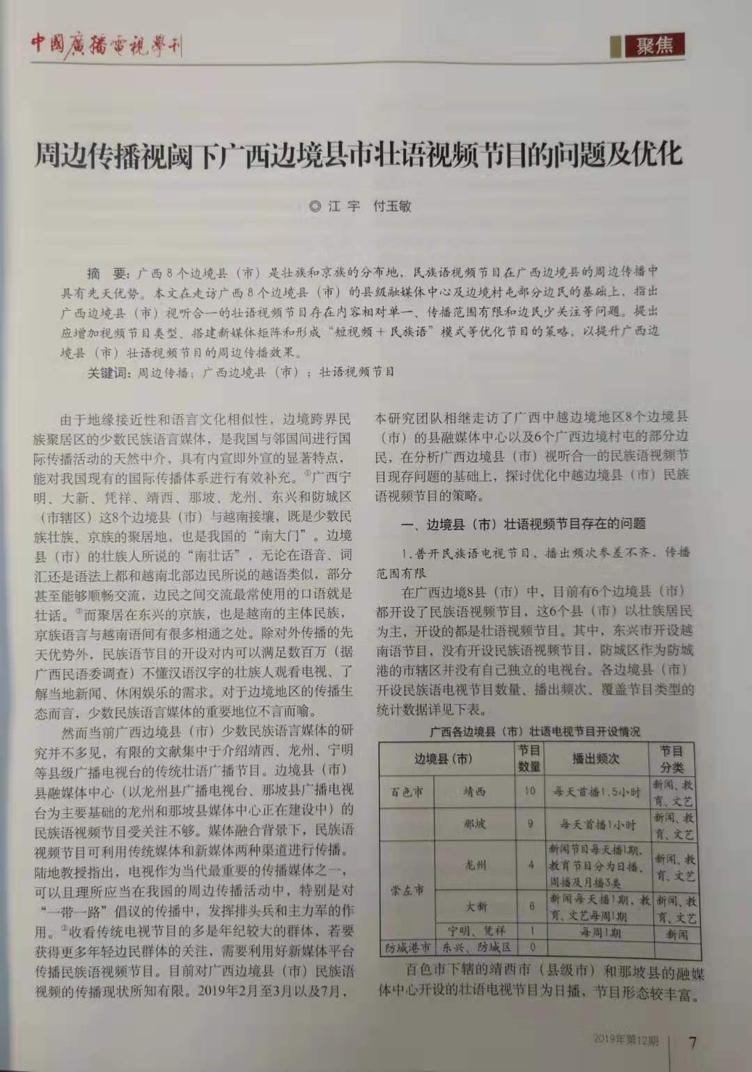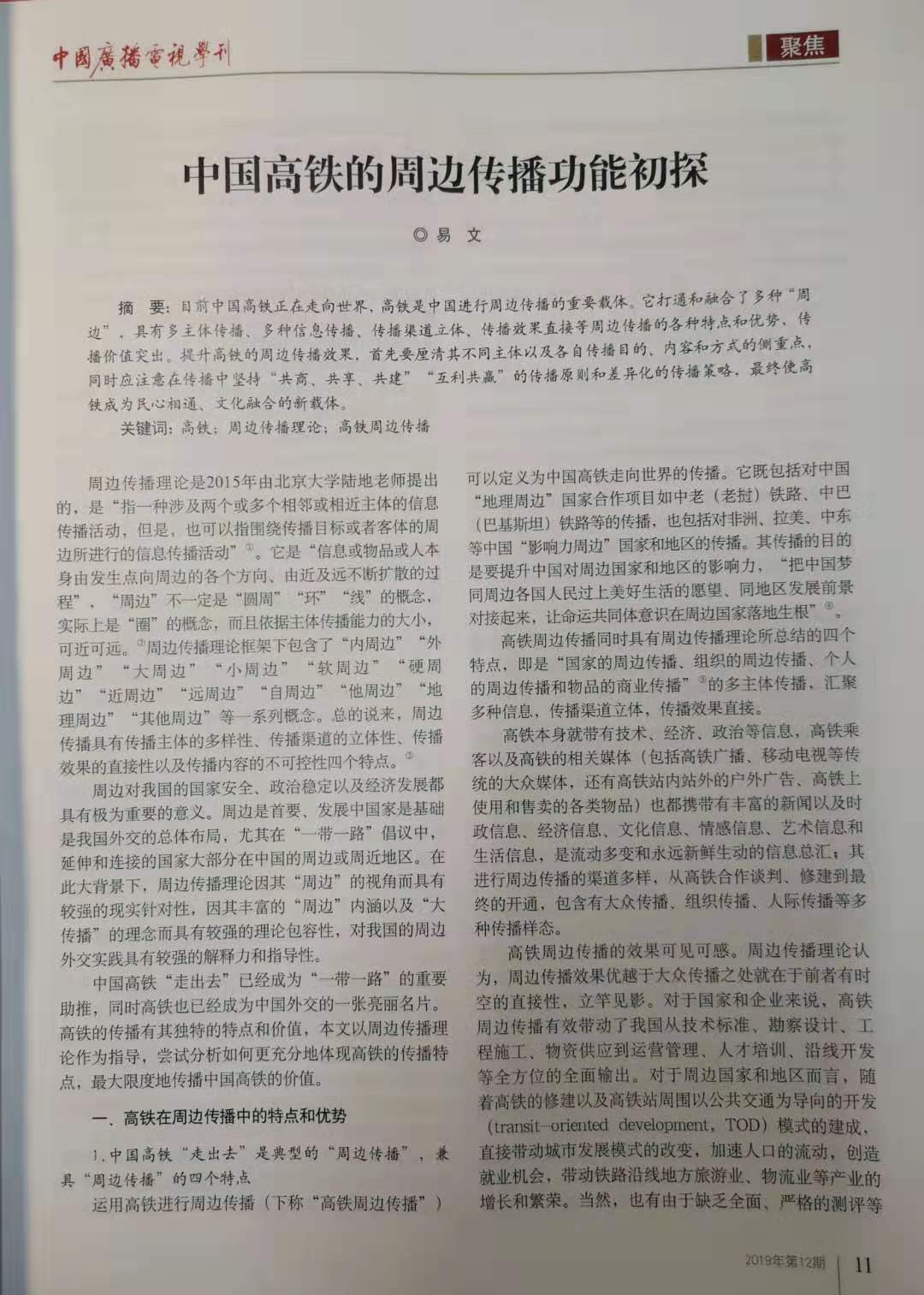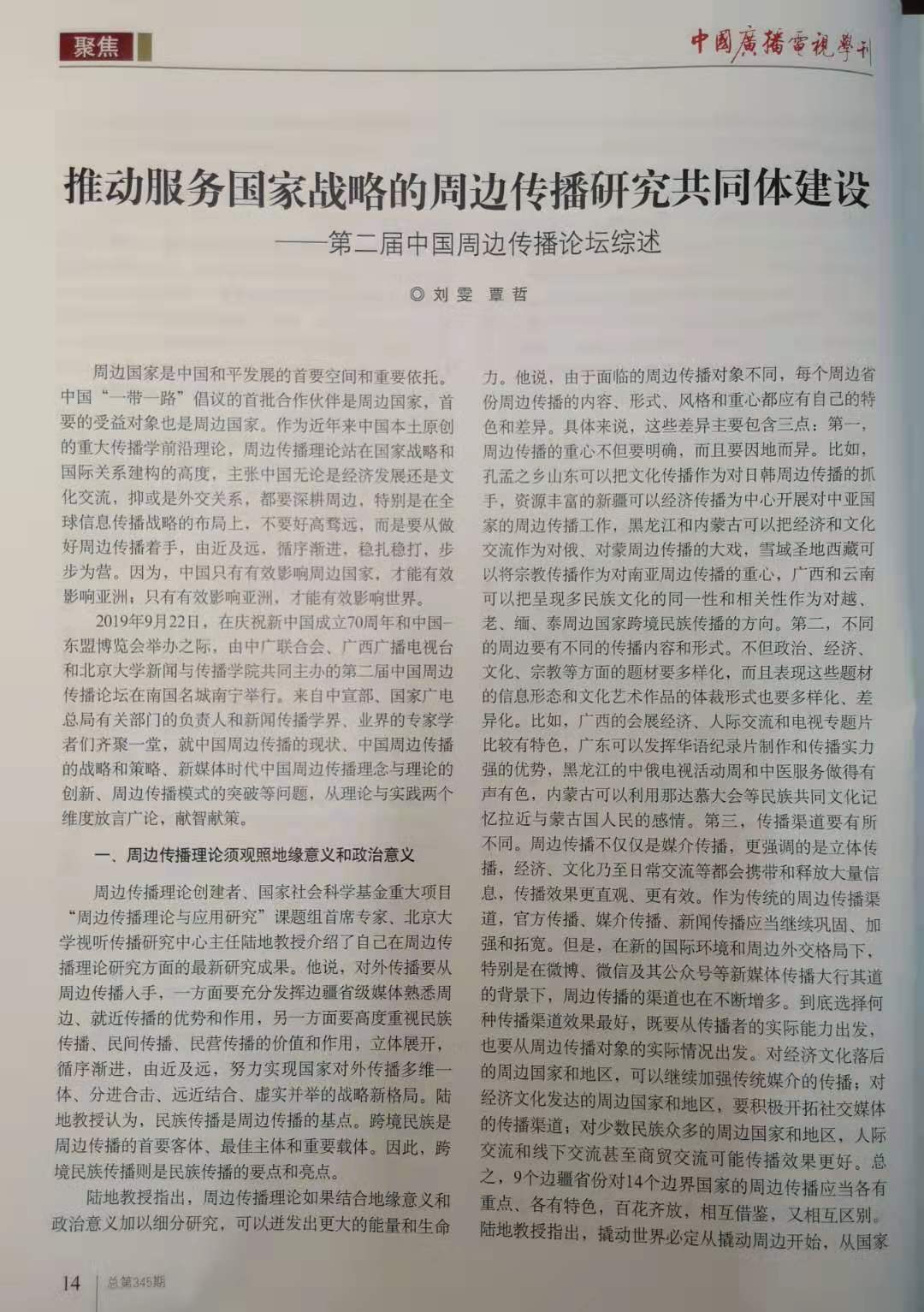 2019年12期,《中国广播电视学刊》发表了公司易文教授、江宇副教授以及覃哲博士等分别撰写的学术论文、论坛综述。这也是北京大学beet365陆地教授主持的国家社科基金重大项目《周边传播理论与应用研究》阶段性成果。
