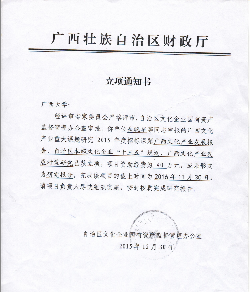 公司岳晓华教授2015年申报广西文化产业重大课题研究项目获得立项