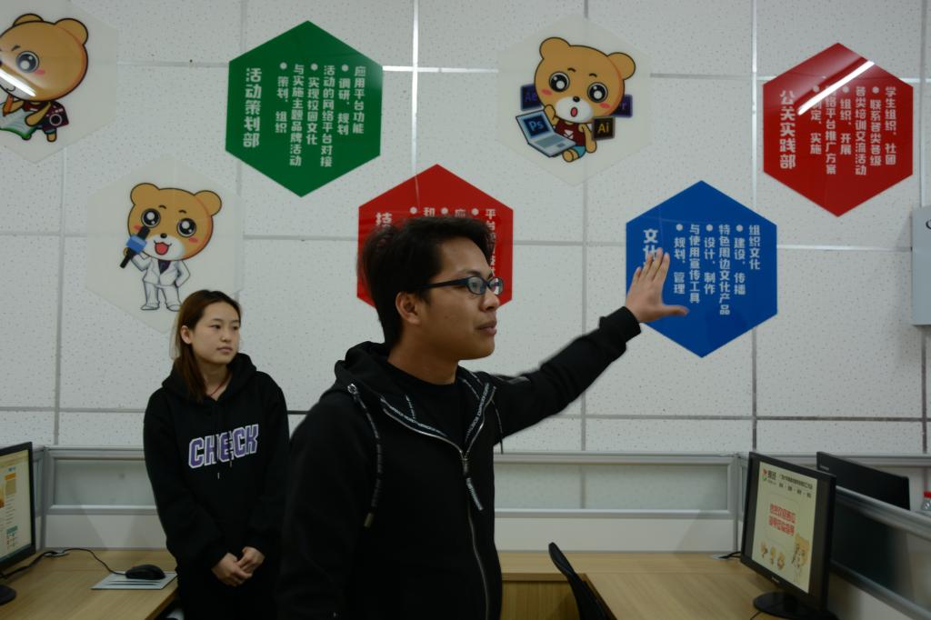 beet365易班工作站站长覃玉富同学向来访嘉宾介绍了部门职能、文化建设、活动案例等方面,并展示了具有学科特色的周边文化产品,获得了李迎春副经理一行的充分肯定。
