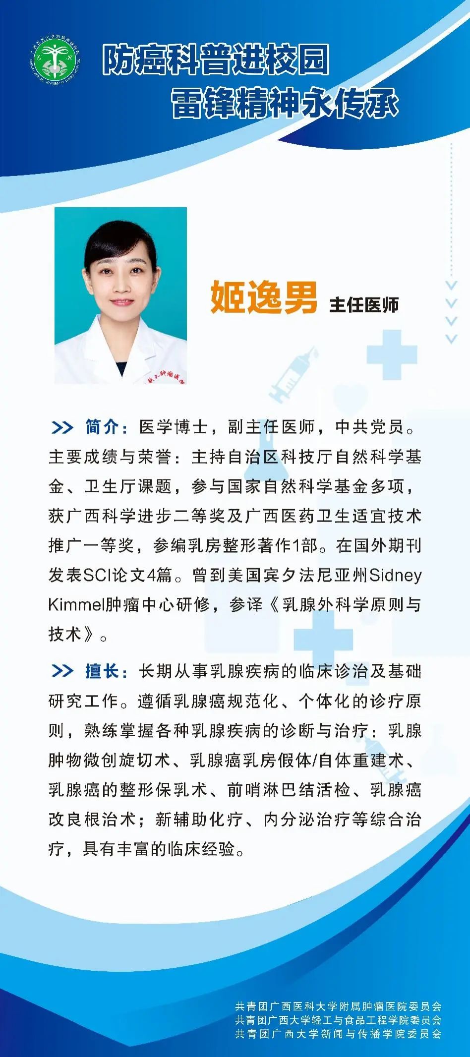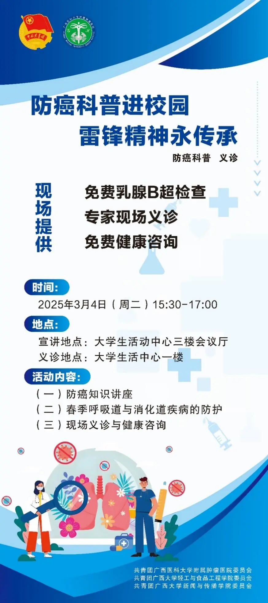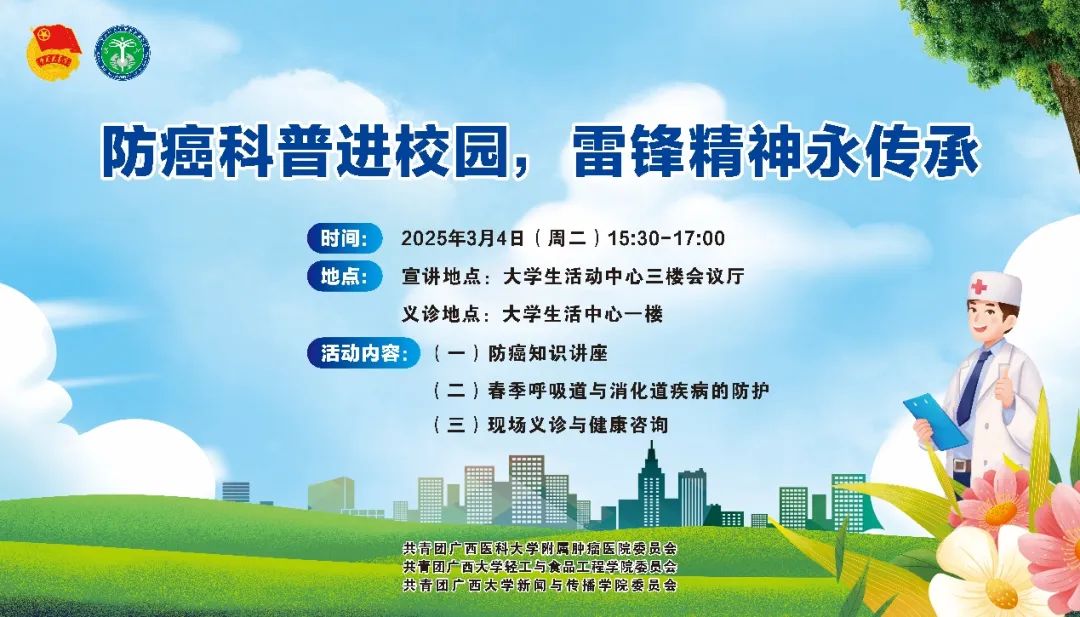 3月4日下午,公司联合轻工与食品工程学院、广西医科大学附属肿瘤医院,将在老员工活动中心举办“防癌科普进校园”活动,活动包含防癌知识讲座、现场义诊与健康咨询等。