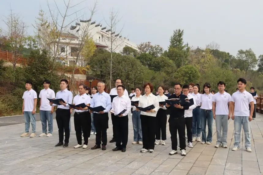 朗诵环节将活动推向了高潮。在庄严肃穆的氛围中,师生们齐声朗诵《湘江之歌》,用铿锵有力的声音传达出对革命先烈的无限敬仰和对中国共产党精神的坚定传承。“一草一木一忠魂,一山一石一丰碑”,每一句都掷地有声,每一个字都饱含深情。通过朗诵,大家仿佛看到了红军战士们浴血奋战的英勇身影,感受到了他们坚定的革命信念和无私的奉献精神。师生们用声音传递出对英雄们的无限缅怀和敬仰,同时也表达了对中国共产党精神的坚定传承和发扬光大的决心。最后,大家在纪念馆内合影留念,定格下了这一庄严而神圣的时刻。