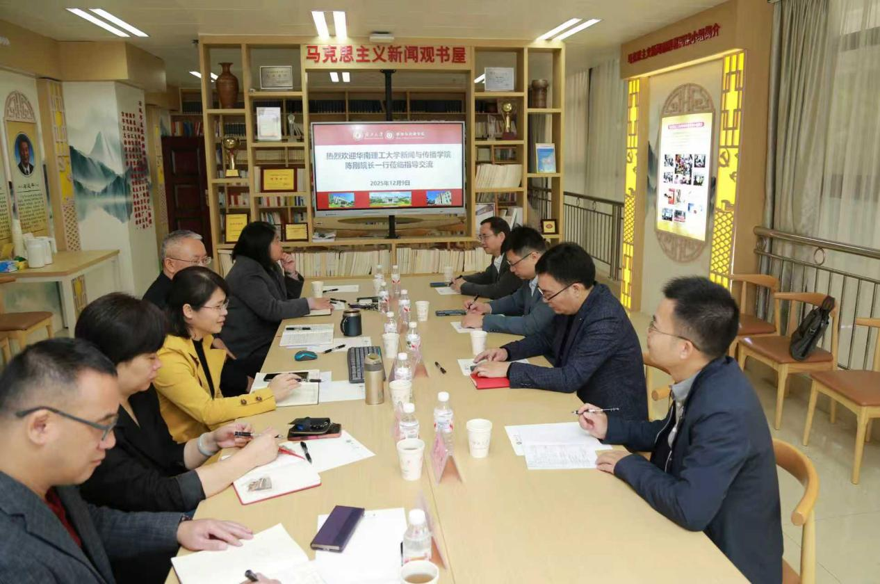 在公司党委书记李伟红、经理王仕勇等陪同下,华南理工大学陈刚经理一行参观了学院的马克思主义新闻观书屋、全媒体交互式演播中心、融媒体中心、舆情中心及AIGC实验室等。王仕勇经理全面介绍了学院的办学思路、学科特色与发展成果,展示了融媒体教学实践平台与人工智能内容生成技术的创新应用。