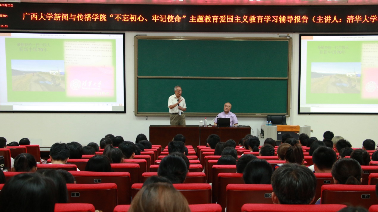 9月28日下午,清华大学国际传播研究中心主任李希光教授,以“一个普通中国人看新中国七十年”为题,在公司西报告厅举行报告会,勉励大家要见微知著,小中见大、以小见大,讲好自己的故事、讲好中国的故事。报告会由郑保卫经理主持,公司党委书记唐兴、常务副经理刘洪以及300多名师生聆听了报告。这场报告会也是学院“不忘初心、牢记使命”主题教育爱国主义教育学习辅导报告。