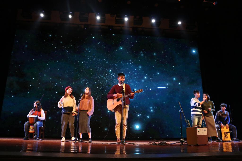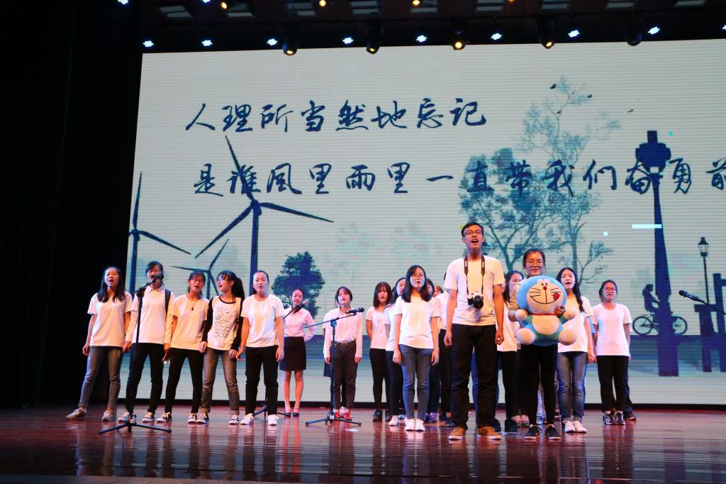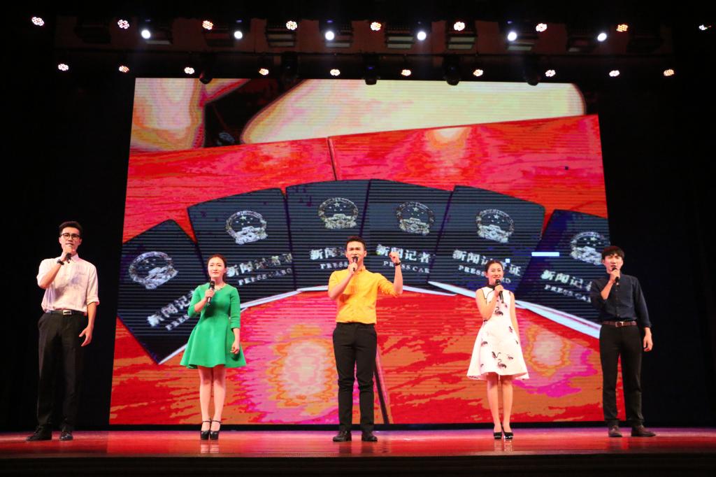 在第一篇章“云程发轫”,新闻153班带来合唱《小幸运》,“遇见新闻时还未觉年轻,离别后才发现瞬息光阴”唱出许多新闻学子的心声。播音141班带来朗诵《承继·出发》,“走别人走不了的路,去别人去不了的地方,这就是记者”,每一次重复,感情层层递进,调动起全场观众的情绪。